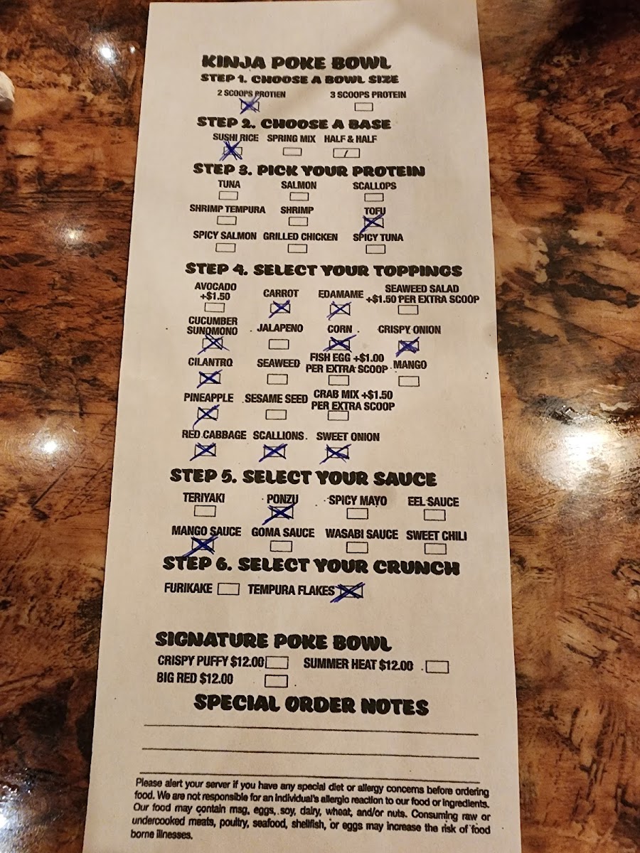 Tuna, spicy tuna, crab mix, seaweed salad, cucumber salad, pineapple, furikake, ponzu sauce, eel sauce, and goma sauce.